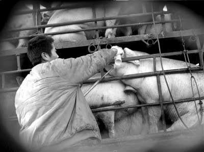 近日,本報(bào)(京華時(shí)報(bào))接到舉報(bào)稱(chēng),在(北京)東六環(huán)施園北橋下的高速路應(yīng)急車(chē)道上,有不法生豬商販給生豬注水。記者經(jīng)過(guò)暗訪(fǎng)掌握了兩家供應(yīng)商制造“注水豬”的過(guò)程,并發(fā)現(xiàn)這些“注水豬”被運(yùn)至通州區(qū)潞城鎮(zhèn)工業(yè)園區(qū)的大紅門(mén)肉類(lèi)食品有限公司(以下簡(jiǎn)稱(chēng)肉食公司)。 12月5日,在獲取大量證據(jù)后,記者將此事反映至有關(guān)部門(mén)。在執(zhí)法過(guò)程中,有關(guān)部門(mén)雖未能抓到現(xiàn)行,但表示在高速路上給生豬注水的情況在北京尚屬首次發(fā)現(xiàn)。目前,肉食公司已對(duì)上述兩家供應(yīng)商作出罰款5萬(wàn)元的決定,同時(shí)將對(duì)其永久取消供應(yīng)關(guān)系。
