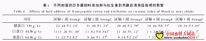 對(duì)于血清中甘油三酯的含量,添加忍冬藤后,試驗(yàn)3組比對(duì)照組下降了2.28%,差異顯著(P<0.05)。試驗(yàn)1組和試驗(yàn)2組的甘油三酯含量略有提高,但差異不顯著(P>0.05)。 對(duì)于血清中總膽固醇的含量,與對(duì)照組比較,各試驗(yàn)組呈現(xiàn)出隨著忍冬藤水平的提高而下降的趨勢(shì),其中試驗(yàn)3組顯著低于對(duì)照組差異顯著(P<0.05),說(shuō)明添加0.5%忍冬藤能明顯降低肉雞血清中總膽固醇的含量。 由于血清甘油三酯和血清膽固醇是反映機(jī)體血脂水平的兩個(gè)常用指標(biāo),故從降低肉雞血脂水平的角度來(lái)看,日糧中以添加0.5%忍冬藤效果最佳。 2.8 不同劑量的忍冬藤飼料添加劑與抗生素對(duì)肉雞血清免疫指標(biāo)的影響 試驗(yàn)結(jié)果從表6可見(jiàn),添加忍冬藤后,各試驗(yàn)組的血清總蛋白差異不顯著(P>0.05),但試驗(yàn)1和試驗(yàn)2組的血清總蛋白顯著高于試驗(yàn)組5(對(duì)照組),差異顯著(P<0.05);對(duì)于血清蛋白指標(biāo),各試驗(yàn)組之間差異不顯著(P>0.05);對(duì)于血清蛋白指標(biāo),試驗(yàn)1組和試驗(yàn)2組顯著高于試驗(yàn)組5(對(duì)照組),差異顯著(P<0.05),但試驗(yàn)3組、試驗(yàn)2組和試驗(yàn)3組的血清球蛋白指標(biāo)與對(duì)照5組差異不顯著(P>0.05)。 3 討 論 3.1 忍冬藤的藥理作用及其利用價(jià)值 忍冬藤是金銀花的藤莖,與金銀花一樣,是重要的藥用植物,具有很高的藥用價(jià)值,其功效為清熱解毒、抗菌消炎、通經(jīng)活絡(luò)。其藥理作用主要為消炎作用,并對(duì)多種致病性細(xì)菌有抑制作用,主要有效成分為忍冬 、木犀草素、黃酮類和生物鹼等,所含的木犀草素稀釋為1:350000時(shí),在體外仍能抑制葡萄球菌及枯草桿菌的生長(zhǎng)。民間廣泛地將忍冬藤用于治療熱毒血痢、癰腫瘡毒和筋骨疼痛,尤其是中毒性疾病如毒菇中毒、農(nóng)藥和重金屬中毒,新鮮的忍冬藤更效果更佳[4]。所以在人醫(yī)疾病方面,忍冬藤應(yīng)用較為廣泛,而在畜牧生產(chǎn)中,忍冬藤較少利用,從試驗(yàn)可見(jiàn)忍冬藤具有廣闊的開發(fā)前景。 3.2 忍冬藤飼料添加劑的作用原理 3.2.1 忍冬藤飼料添加劑能提高肉雞成活率、飼料轉(zhuǎn)化率與肉雞增重 從試驗(yàn)表明,不同水平的忍冬藤飼料添加劑均能提高肉雞成活率、飼料轉(zhuǎn)化率與肉雞增重,忍冬藤飼料添加劑的促生長(zhǎng)作用可能與忍冬藤飼中含有許多功能成分有關(guān),如忍冬 、木犀草素、黃酮類、生物鹼、多糖、酚類及氨基酸、微量元素以及其他未知的促生長(zhǎng)因子等有關(guān)。研究表明:忍冬藤中黃酮類、內(nèi)酯類具有提高機(jī)體體液免疫和細(xì)胞免疫功能的作用;忍冬藤中氨基酸含量十分豐富,故忍冬藤的促生長(zhǎng)作用可能與其提高動(dòng)物的免疫功能、抗菌消炎和提供一定的必需氨基酸有關(guān)[5]。 3.2.2 忍冬藤飼料添加劑能提高肉雞免疫器官指數(shù) 胸腺、法氏囊及脾臟是禽類的主要免疫器官,是免疫細(xì)胞形成和分化、產(chǎn)生抗體的主要場(chǎng)所,所以,胸腺、法氏囊及脾臟的重量可用于評(píng)價(jià)雛雞的免疫狀態(tài)。免疫器官的發(fā)育狀況直接影響機(jī)體免疫應(yīng)答水平和抵抗外來(lái)微生物的感染和侵入的能力,其絕對(duì)重量和相對(duì)重量增加,說(shuō)明機(jī)體的細(xì)胞免疫和體液免疫機(jī)能增強(qiáng)。本試驗(yàn)表明:忍冬藤飼料添加劑能促進(jìn)肉雞免疫器官的生長(zhǎng)發(fā)育,可作為一種抗原物質(zhì),促進(jìn)免疫器官發(fā)育、肉雞整體免疫機(jī)能加強(qiáng)、抵抗各種病原微生物感染的能力和抵抗各種應(yīng)激的能力得到提高,與肉雞生長(zhǎng)變化速度一致[6]。 3.2.3 忍冬藤飼料添加劑能提高實(shí)驗(yàn)動(dòng)物小白鼠的免疫效果 忍冬藤飼料添加劑的免疫效果可從小白鼠巨噬細(xì)胞吞噬作用和小白鼠脾淋巴細(xì)胞玫瑰花結(jié)形成的結(jié)果體現(xiàn)出來(lái)。左旋咪唑是獸醫(yī)臨床上常用的抗蠕蟲藥,也是一種常用的免疫調(diào)節(jié)劑,它能使機(jī)體免疫功能低下者恢復(fù)正常,并能增強(qiáng)正常機(jī)體細(xì)胞免疫和體液免疫功能。其作用機(jī)理是所含的咪唑基團(tuán)可誘導(dǎo)機(jī)體產(chǎn)生各種淋巴因子,促進(jìn)T淋巴細(xì)胞的成熟;其代謝產(chǎn)物OMPI有清除自由基的功能,可保護(hù)細(xì)胞免受氧化自由基的損傷,并可使受抑制的吞噬細(xì)胞和淋巴細(xì)胞功能恢復(fù)正常,從而增強(qiáng)機(jī)體免疫功能。動(dòng)物機(jī)體內(nèi)巨噬細(xì)胞具有強(qiáng)大的吞噬作用,是機(jī)體防御功能的重要組成部分,具有消除病原體,消除異物,消除體內(nèi)衰老死亡細(xì)胞以及吞噬處理抗原作用。忍冬藤組的試驗(yàn)結(jié)果指標(biāo)顯著高于空白對(duì)照組.甚至高于西藥左旋咪唑組;與空白對(duì)照組相比,巨噬細(xì)胞吞噬百分率、吞噬指數(shù)均差異原著.由此證明,忍冬藤本身就是一種免疫活性物質(zhì).能提高免疫原性能,而藥理研究也已證明忍冬藤和金銀花均能促進(jìn)網(wǎng)狀內(nèi)皮系統(tǒng),增強(qiáng)細(xì)胞吞噬力,還能提高 淋 巴細(xì)胞功能,使細(xì)胞內(nèi) 含量增加,溶血素和溶血空斑值升高,從而增強(qiáng)機(jī)體的免疫功能[7]. 3.2.4 忍冬藤飼料添加劑能提高肉雞肝臟合成蛋白