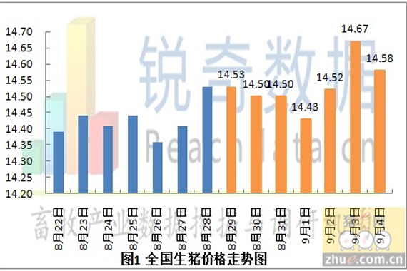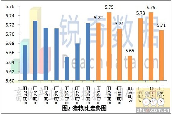據(jù)銳奇數(shù)據(jù)監(jiān)測(cè)的當(dāng)?shù)厣i報(bào)價(jià)信息統(tǒng)計(jì),2012年9月5日全國(guó)各省生豬平均價(jià)格為14.58元/千克,較昨日(9月4日)下跌0.09元/千克,上跌幅度為0.61%,較上周同期(8月29日)上漲0.05元/千克,上漲幅度為0.34%。(見(jiàn)圖1)今日豬糧比為5.71:1,較昨日下跌0.04,跌幅為0.69%。較上周同期(8月29日)下跌0.01,跌幅為0.17%。(見(jiàn)圖2)