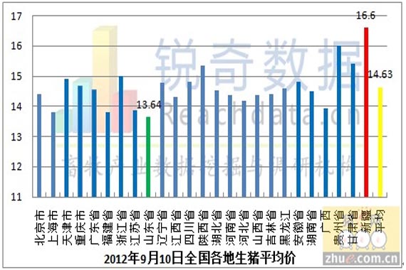 9月10日生豬市場(chǎng)行情較昨日震蕩平穩(wěn),全國(guó)生豬價(jià)格最高地區(qū)為新疆,生豬平均價(jià)為16.6元/千克,最低地區(qū)為山東省,生豬平均價(jià)為13.64元/千克,兩地區(qū)差異非常明顯,全國(guó)大部分地區(qū)生豬行情震蕩調(diào)整。