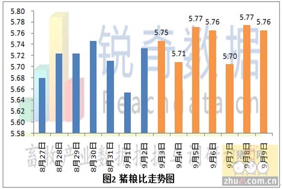 據(jù)銳奇數(shù)據(jù)監(jiān)測(cè)的當(dāng)?shù)厣i報(bào)價(jià)信息統(tǒng)計(jì),2012年9月10日全國(guó)各省生豬平均價(jià)格為14.63元/千克,較昨日(9月9日)下跌0.01元/千克,下跌幅度為0.07%,較上周同期(9月3日)上漲0.11元/千克,上漲幅度為 0.76%。(見圖1)今日豬糧比為5.76:1,較昨日下跌0.01,跌幅為0.17%。較上周同期(9月3日)上漲0.03,漲幅為0.52%。(見圖2)