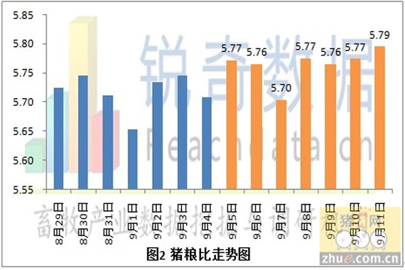 據(jù)銳奇數(shù)據(jù)監(jiān)測的當(dāng)?shù)厣i報價信息統(tǒng)計,2012年9月12日全國各省生豬平均價格為14.69元/千克,較昨日(9月11日)上漲0.03元/千克,上漲幅度為0.20%,較上周同期(9月5日)上漲0.09元/千克,上漲幅度為0.62%。(見圖1)今日豬糧比為5.79:1,較昨日上漲0.02,漲幅為0.35%。較上周同期(9月5日)上漲0.08,漲幅為1.41%。(見圖2)