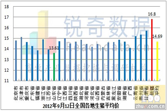 9月12日生豬市場行情較昨日震蕩上揚,全國生豬價格最高地區(qū)為新疆,生豬平均價為16.8元/千克,最低地區(qū)為山東省,生豬平均價為13.61元/千克,兩地區(qū)差異非常明顯,全國大部分地區(qū)生豬行情震蕩調(diào)整。