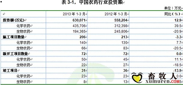 2013年1-3月,中國農(nóng)藥行業(yè)投資總額為63.0億元,同比增長12.9%。其中化學(xué)農(nóng)藥投資43.5億元,同比增長39.5%;生物農(nóng)藥投資19.4億元,同比下降20.9%。化學(xué)農(nóng)藥和生物農(nóng)藥投資出現(xiàn)了顯著分化,且分化程度較2013年1-2月進(jìn)一步加劇。前3個(gè)月累計(jì),生物農(nóng)藥投資在總投資中所占比重為30.8%,較上年同期下降了13.2個(gè)百分點(diǎn);降幅之大為歷年來罕見。