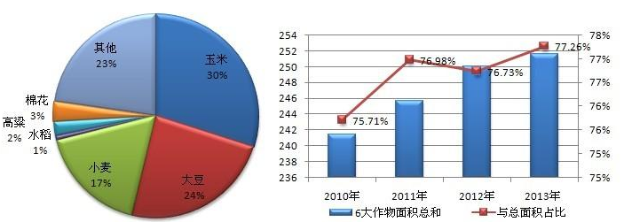 圖:2013年美國(guó)主要作物面積占比: 表:近4年主要作物種植面積與總面積占比