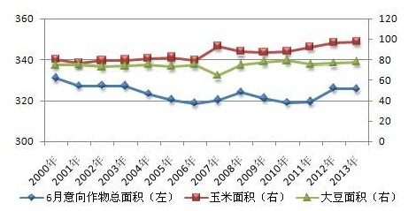 玉米6月意向種植面積數(shù)據(jù)中,基本延續(xù)年度持續(xù)增加趨勢(shì),2013年6月意向數(shù)據(jù)與2000年面積相比上漲17.8萬(wàn)英畝,玉米面積漲幅22.36%。而大豆種植面積基本保持平穩(wěn),變化幅度并不大。