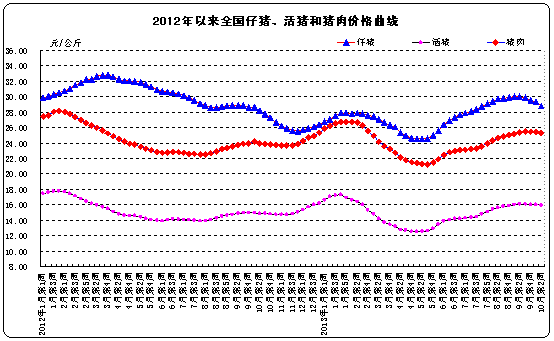 生豬價格。全國活豬平均價格15.93元/公斤,比上周下降0.4%,與去年同期相比上漲6.8%?;钬i價格上漲省份8個,下降省份21個,持平省份1個。西北地區(qū)活豬平均價格較高,為16.65元/公斤;華南地區(qū)較低,為15.29元/公斤。全國仔豬平均價格28.79元/公斤,比上周下降1.8%,同比上漲2.2%。仔豬價格上漲省份6個,下降省份24個。全國豬肉平均價格25.30元/公斤,比上周下降0.6%,同比上漲5.5%。豬肉價格上漲省份6個,下降省份22個,持平省份2個。西北地區(qū)豬肉平均價格較高,為26.66元/公斤;華南地區(qū)較低,為23.65元/公斤。