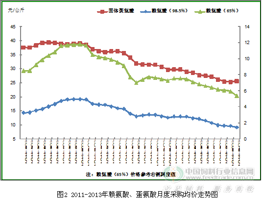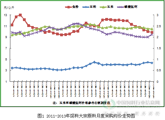 說(shuō)明:本文觀點(diǎn)和飼料生產(chǎn)數(shù)據(jù)來(lái)源于農(nóng)業(yè)部重點(diǎn)跟蹤企業(yè)月度統(tǒng)計(jì)報(bào)表監(jiān)測(cè)數(shù)據(jù),為預(yù)測(cè)值。2013年全年飼料工業(yè)統(tǒng)計(jì)數(shù)據(jù)正在上報(bào)匯總審核中,以農(nóng)業(yè)部全國(guó)飼料工作辦公室最終公布數(shù)據(jù)為準(zhǔn)。 2013年,我國(guó)飼料行業(yè)經(jīng)受了2012年末“速成雞”及今年3月“黃浦江死豬”、人感染“H7N9流感”疫情等多重影響,飼料產(chǎn)量一、二季度下滑,三季度出現(xiàn)上升拐點(diǎn),四季度全面回升,預(yù)計(jì)全年飼料產(chǎn)量和上年基本持平。隨著新修訂《條例》及配套規(guī)章的陸續(xù)實(shí)施,飼料企業(yè)規(guī)范化、標(biāo)準(zhǔn)化管理與運(yùn)營(yíng)得到有效加強(qiáng),全國(guó)飼料質(zhì)量安全狀況保持穩(wěn)定向好的趨勢(shì)。飼料行業(yè)的發(fā)展基本適應(yīng)了國(guó)家宏觀改革的整體步伐和改革創(chuàng)新發(fā)展思路和發(fā)展模式,持續(xù)彰顯了飼料行業(yè)適應(yīng)國(guó)家經(jīng)濟(jì)改革轉(zhuǎn)型的調(diào)整與有效過(guò)渡。 一、基本情況 據(jù)統(tǒng)計(jì)監(jiān)測(cè)數(shù)據(jù)預(yù)測(cè),2013年全國(guó)飼料工業(yè)總產(chǎn)量19 100萬(wàn)噸,與2012年同比下降1.8%。其中,配合飼料16 170萬(wàn)噸,同比下降1.2%;濃縮飼料2 300萬(wàn)噸,同比下降6.8%;添加劑預(yù)混合飼料630萬(wàn)噸,同比增長(zhǎng)1.7%。 1、不同品種飼料產(chǎn)量有增有降。全年預(yù)計(jì),豬飼料8 000萬(wàn)噸,同比增長(zhǎng)3.6%;蛋禽飼料3 050萬(wàn)噸,同比下降5.5%;肉禽飼料5 050萬(wàn)噸,同比下降8.4%;水產(chǎn)飼料1 900萬(wàn)噸,同比增長(zhǎng)0.4%;反芻飼料780萬(wàn)噸,同比增長(zhǎng)0.6%;其他飼料320萬(wàn)噸,同比增長(zhǎng)1.1%。 2、主要飼料原料價(jià)格波動(dòng)幅度較大。1~5月,除棉粕、菜粕外,其他飼料原料價(jià)格均呈逐月走低行情。6~10月,玉米、進(jìn)口魚(yú)粉、磷酸氫鈣和氨基酸價(jià)格繼續(xù)回落,其他大宗飼料原料價(jià)格逐月回升。棉粕、菜粕價(jià)格環(huán)比呈現(xiàn)逐月上漲行情。而11、12月,除麥麩、磷酸氫鈣、和蛋氨酸價(jià)格環(huán)比上漲外,其他大宗原料價(jià)格有所下降。 2013年1~12月玉米累計(jì)采購(gòu)均價(jià)為2 420元/噸,同比下降2.4%;豆粕累計(jì)采購(gòu)均價(jià)為4 150元/噸,同比增長(zhǎng)11.3%;棉粕、菜粕采購(gòu)價(jià)格12月比年初分別漲22.3%和16.2%;魚(yú)粉累計(jì)采購(gòu)均價(jià)為11 110元/噸,同比增長(zhǎng)3.5%,但進(jìn)口魚(yú)粉價(jià)格環(huán)比一直呈下跌走勢(shì),從1月的12 160元/公斤降到12月的9780元/公斤,降幅19.6%,見(jiàn)圖1。 3、飼料產(chǎn)品價(jià)格同比整體上漲。數(shù)據(jù)顯示,1~12月飼料產(chǎn)品全國(guó)均價(jià)同比漲幅5.3%。其中,育肥豬配合飼料累計(jì)同比漲幅6.2%,蛋禽配合飼料5.0%,肉禽配合飼料2.4%;育肥豬濃縮飼料累計(jì)同比漲幅4.9%,蛋禽濃縮飼料13.4%,肉禽濃縮飼料3.7%;4%大豬預(yù)混合飼料累計(jì)同比漲幅8.4%,蛋禽預(yù)混合飼料0.2%,肉禽預(yù)混合飼料1.0%。 4、不同規(guī)模企業(yè)產(chǎn)量漲跌不均。從1~12月不同規(guī)模企業(yè)情況看,月產(chǎn)10萬(wàn)噸以上的大型集團(tuán)企業(yè)累計(jì)同比下降7.9%。月產(chǎn)1萬(wàn)~10萬(wàn)噸的企業(yè)產(chǎn)量累計(jì)同比增長(zhǎng)5.8%;月產(chǎn)1萬(wàn)噸以下的企業(yè)產(chǎn)量累計(jì)同比下降11.0%。 二、運(yùn)行特點(diǎn) 1、飼料產(chǎn)量前低后高、呈總體持平略降。據(jù)重點(diǎn)跟蹤企業(yè)近三年生產(chǎn)情況顯示:從總產(chǎn)量月度走勢(shì)規(guī)律情況看,2011、2012年各年度產(chǎn)量高峰期出現(xiàn)在7、8月份,年初和年末月份則處于相對(duì)低谷,呈“倒V”走勢(shì)。2013年則不同,8月份之前飼料產(chǎn)量同比下降非常明顯,單月同比下降幅度在10%以上,進(jìn)入9月份以后才有所緩解和回升,形成前低后高走勢(shì)。這主要與今年消費(fèi)環(huán)境和養(yǎng)殖行情密切相關(guān)。年初生豬價(jià)格持續(xù)下跌,豬糧比連續(xù)5個(gè)月跌至盈虧平衡線以下,至7月份,生豬價(jià)格同比才略有回升,8月起豬糧比重回盈虧平衡線以上,養(yǎng)殖積極性開(kāi)始恢復(fù),四季度肉類產(chǎn)品消費(fèi)進(jìn)入旺季,以及養(yǎng)殖戶對(duì)春節(jié)消費(fèi)的期待,飼料產(chǎn)量止跌回升。 2、飼料產(chǎn)品結(jié)構(gòu)出現(xiàn)適應(yīng)性調(diào)整。2013年,飼料產(chǎn)品類別同比呈現(xiàn)“一平一降一增長(zhǎng)”特點(diǎn):配合飼料持平,濃縮飼料下降,添加劑預(yù)混合飼料增長(zhǎng)。由于今年行情低迷和部分原料價(jià)格的走低,飼料產(chǎn)品結(jié)構(gòu)和近兩年比略有調(diào)整,主要表現(xiàn)在配合飼料的漲幅趨緩,而近兩年一直處于萎縮之勢(shì)的濃縮飼料下降的速度有所緩和,添加劑預(yù)混合飼料為飼料產(chǎn)量的亮點(diǎn)。主要原因包括:一是畜產(chǎn)品價(jià)格持續(xù)低迷,加上從農(nóng)戶手中直接購(gòu)買原料價(jià)格相對(duì)較低,散養(yǎng)戶為降低成本,更多地選擇預(yù)混合飼料和適當(dāng)選擇濃縮飼料;二是隨著大規(guī)模農(nóng)場(chǎng)的發(fā)展,為了提高養(yǎng)殖水平,在飼料方