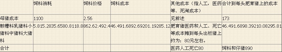 從上表可知道:⑴ 乳豬從開(kāi)食到改用小豬飼料的7~50日齡期間:共消耗教槽料5.8千克,乳豬飼料15.28千克。⑵ 小豬從50日齡到87日齡(15~35公斤重階段)共消耗小豬飼料:35.65千克。⑶ 中豬從87日齡到125日齡(35~65公斤體重階段)共消耗中豬飼料:80.8千克。⑷ 大豬從125日齡到168日齡(65~108公斤體重階段)共消耗大豬飼料:118.8千克。⑸ 中小型豬場(chǎng)以一頭母豬年產(chǎn)20頭仔豬的保守估計(jì)來(lái)計(jì)算成本,一頭母豬年消耗飼料1100千克,母豬飼料成本主要為妊娠母豬飼料和哺乳母豬飼料,平均一下價(jià)格為:2.56元/千克,所以,一頭母豬年飼料成本:1100×2.56=2816元,加上藥物免疫和人工成本484元,則一共為3300元。 另外,購(gòu)置母豬時(shí)的成本一般為1800元,至于購(gòu)置成本,則淘汰母豬可以出售,也大約就是1800元,母豬目前可以按國(guó)家有關(guān)規(guī)定進(jìn)行銷(xiāo)售,所以,購(gòu)置成本可以用這項(xiàng)收入來(lái)抵消。 剛引進(jìn)的后備母豬約4月齡,需要繼續(xù)飼養(yǎng)3個(gè)月才能配種,這中間消耗后備母豬飼料240千克,成本為:240×2.49=598元,加上期間的藥費(fèi)42元,運(yùn)輸和人工200元,共840元,以后進(jìn)入生產(chǎn)期成本計(jì)算期,生產(chǎn)期大約為5年(中小型豬場(chǎng)護(hù)理得好,可以達(dá)到五年使用期限),則每年攤?cè)牒髠淠肛i飼養(yǎng)成本840÷5=168元。 所以,母豬一年的成本為3300+168=3468元。 由此可以計(jì)算出每頭初生仔豬(含喂養(yǎng)它的奶水)的成本為3468÷20=173元。每頭肥育豬到出欄時(shí)的總成本計(jì)算表:千克、元/千克、元/頭。 注:其中飼料價(jià)格見(jiàn)文章最后的飼料配方表,即:小豬料2600元/噸,中豬料2490元/噸,大豬料2400元/噸,妊娠母豬料2420元/噸,哺乳母豬2690元/噸,后備母豬料2490元/噸,① 由上表可知:養(yǎng)出一頭30斤以上的仔豬的成本為173+46.4+91.68=311元。② 由表可知:一頭肥育豬總生產(chǎn)成本為:80+890=970元/頭。③ 純利潤(rùn)計(jì)算: 按現(xiàn)在的行情:生豬價(jià)格15元/公斤,則養(yǎng)到108公斤生豬出售收入為:1620元。 純利潤(rùn)為:1620-970=650元/頭。 如果采用微生態(tài)技術(shù),發(fā)酵技術(shù),增強(qiáng)豬只抗病力,中小型豬場(chǎng)的精細(xì)化管理,和照顧豬只福利的新技術(shù)(如活動(dòng)場(chǎng)、發(fā)酵床技術(shù)、夏天降溫得力措施,冬天保暖措施等),則降低豬只死亡率和得病率,可以減少這方面的成本約40元,同時(shí),母豬年產(chǎn)仔可以增加到24頭,可減少每頭的成本約30元,另外,飼養(yǎng)到120公斤出欄,每頭可以再增加利潤(rùn)約90元,所以,加強(qiáng)管理和養(yǎng)到120公斤重可以再產(chǎn)加總利潤(rùn):160元,這樣每頭總利潤(rùn)可達(dá)到810元,這里指的是純利潤(rùn)。④ 料肉比計(jì)算: 由表可知: 從15公斤到108公斤階段的育肥階段的料肉比為(35.65+80.8+118.8)÷(108-15)=2.53, 如果是從斷奶(28日齡開(kāi)始)到108公斤階段,則料肉比為:(15.28+35.65+80.8+118.8)÷(108-8)=2.50。 從8到15公斤料肉比為1.42。 |