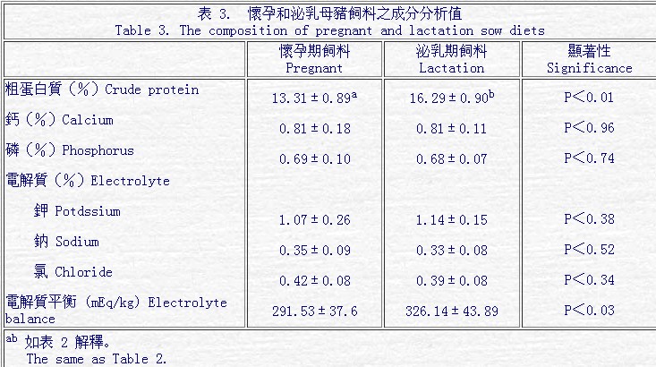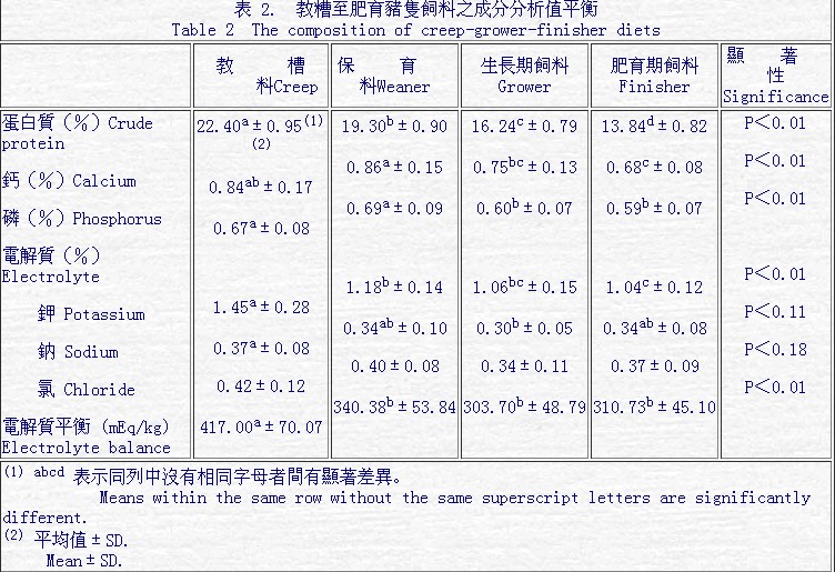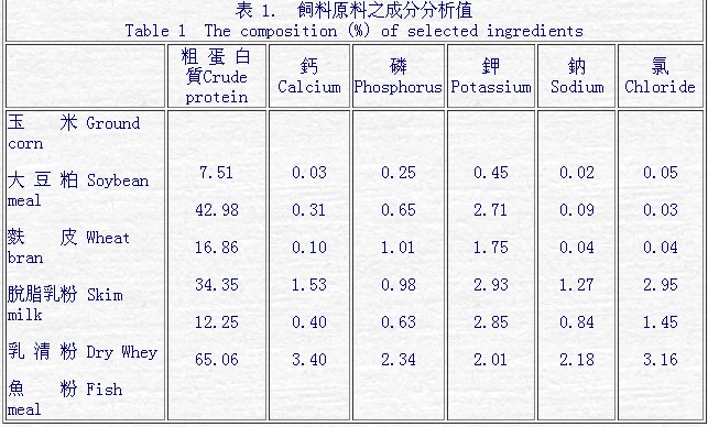 飼料原料一般成分與電解質(zhì)成分分析列于表 1,飼料原料成分之一般分析和電解質(zhì)(鉀、鈉和氯)含量能符合美國 NRC(1988)與 Feedstaffs(1996)之數(shù)值。