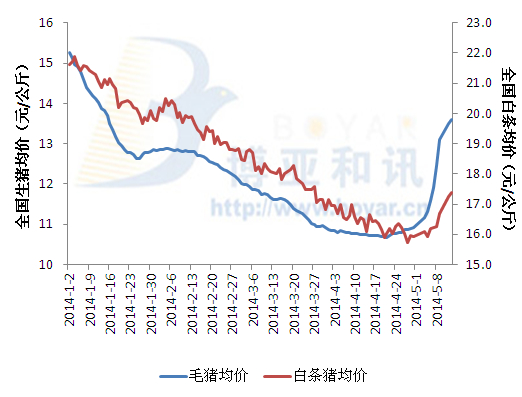 2014年5月13日全國(guó)外三元生豬均價(jià)為13.60元/公斤,較昨日上漲0.10元/公斤,較上周同期(5月06日,下同)上漲2.03元/公斤。白條豬肉均價(jià)17.38元/公斤,較上周同期上漲1.16元/公斤。今日豬料比價(jià)為4.10:1,較昨日上漲0.03,較上周同期上漲0.66,漲幅19.08%。 5月13日生豬市場(chǎng)行情穩(wěn)中小漲。南方市場(chǎng)豬價(jià)漲勢(shì)下滑,并多地呈現(xiàn)下滑勢(shì)頭,浙江、福建、江西、廣西等地豬價(jià)較上周下跌0.3-0.50元/公斤左右;其余大部分地區(qū)豬價(jià)維持上漲態(tài)勢(shì),漲幅0.2-0.9元/公斤左右。 豬價(jià)南跌北漲,生豬跨地區(qū)調(diào)運(yùn)加快,生豬南北價(jià)差逐漸縮小。南方高價(jià)區(qū)受北方豬源的沖擊,理性調(diào)整;北方低價(jià)區(qū)受南方提振作用豬價(jià)開(kāi)始向13.5元/公斤靠攏。本周豬價(jià)經(jīng)過(guò)10天的暴漲之后,各地正式進(jìn)入漲后盤整,當(dāng)前全國(guó)生豬出欄成本價(jià)13.55元/公斤,全國(guó)生豬養(yǎng)殖正式由虧轉(zhuǎn)盈,南方各地甚至出現(xiàn)100元/頭左右的盈利空間。不過(guò)因近期玉米價(jià)格上漲較快,全國(guó)豬糧比價(jià)僅至5.8:1左右。豬價(jià)暴漲,仔豬補(bǔ)欄量增價(jià)格回升,產(chǎn)能淘汰進(jìn)程或放緩。 |