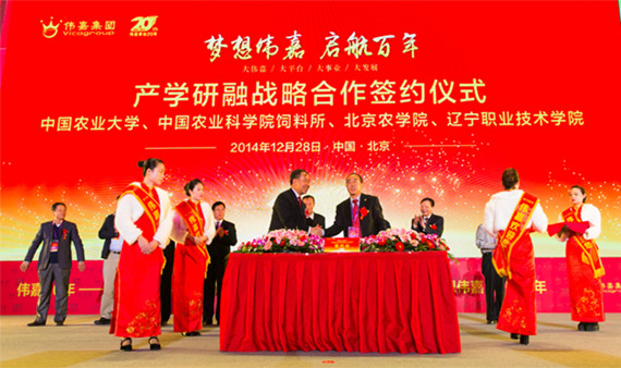 2014年12月28日,由中國畜牧業(yè)協(xié)會、中國農(nóng)業(yè)產(chǎn)業(yè)化龍頭企業(yè)協(xié)會、中國農(nóng)業(yè)大學(xué)、北京市農(nóng)村工作委員會、中關(guān)村農(nóng)業(yè)生物技術(shù)產(chǎn)業(yè)聯(lián)盟提供支持,偉嘉集團主辦的“產(chǎn)學(xué)研融戰(zhàn)略合作簽約儀式暨偉嘉創(chuàng)業(yè)20周年慶祝大會”在北京園博園主展館隆重舉辦。農(nóng)業(yè)部原副部長、中國飼料工業(yè)協(xié)會會長高鴻賓先生,中國工程院院士、中國軍事醫(yī)學(xué)科學(xué)院研究員夏咸柱院士,農(nóng)業(yè)部、科技部、北京市人民政府、北京市發(fā)改委、科委、經(jīng)信委、農(nóng)委、中關(guān)村管委會、海淀區(qū)政府相關(guān)委辦局、各省市相關(guān)領(lǐng)導(dǎo),中科院、中國農(nóng)科院、中國農(nóng)業(yè)大學(xué)、北京農(nóng)學(xué)院、遼寧職業(yè)技術(shù)學(xué)院等科研院所和高校的100多名領(lǐng)導(dǎo)、專家、學(xué)者及大偉嘉事業(yè)戰(zhàn)略合作伙伴等共計2000名嘉賓歡聚一堂,共同見證了產(chǎn)學(xué)研融戰(zhàn)略合作簽約儀式暨偉嘉創(chuàng)業(yè)20周年慶祝大會這一承載著大偉嘉事業(yè)光榮與夢想的偉大歷史時刻。大會主題為“夢想偉嘉,啟航百年” ,由中央電視臺節(jié)目主持人陸梅主持。 會議現(xiàn)場 大會在莊嚴(yán)的國歌和催人奮進的夢想偉嘉之歌聲中拉開帷幕,偉嘉集團董事長兼總裁廖峰先生作為東道主,發(fā)表了熱情洋溢的致辭,他代表偉嘉3000多名員工對蒞臨大會的各界嘉賓表示熱烈的歡迎和衷心的感謝,廖總回顧了大偉嘉事業(yè)20年的發(fā)展歷程,指出創(chuàng)新是偉嘉的核心競爭力,全面描繪了大偉嘉事業(yè)未來的戰(zhàn)略規(guī)劃、發(fā)展目標(biāo)和宏偉愿景,他的講話高屋建瓴、總攬全局,使參會嘉賓深入了解了偉嘉的發(fā)展歷程和未來發(fā)展規(guī)劃。 大會現(xiàn)場精彩的“偉嘉二十年”沙畫表演,以“創(chuàng)立、成長、綻放、展望”四個篇章為節(jié)點,生動的演繹了偉嘉從中國農(nóng)科院租來的兩間小平房創(chuàng)業(yè)開始,在農(nóng)業(yè)部及中國飼料工業(yè)協(xié)會的支持下,成為一家集生物飼料、生物獸藥、微生態(tài)制劑、健康養(yǎng)殖全服務(wù)鏈經(jīng)營于一體的中國農(nóng)牧行業(yè)領(lǐng)軍企業(yè)的風(fēng)雨歷程和未來偉嘉全力攀登全球畜禽健康養(yǎng)殖服務(wù)產(chǎn)業(yè)最高峰的愿景。 會議現(xiàn)場 大會期間,農(nóng)業(yè)部原副部長、中國飼料工業(yè)協(xié)會會長高鴻賓先生和夏咸柱院士及政府部門領(lǐng)導(dǎo)代表、高等院校代表、科研機構(gòu)代表、金融機構(gòu)代表、戰(zhàn)略合作伙伴代表等分別作了精彩的發(fā)言,對偉嘉二十年表示了熱烈祝賀,祝福大偉嘉事業(yè)蒸蒸日上,早日實現(xiàn)“志在興農(nóng)”的偉大理想。 大會期間,偉嘉集團與中國農(nóng)業(yè)大學(xué)、中國農(nóng)業(yè)科學(xué)院飼料研究所、北京農(nóng)學(xué)院、遼寧農(nóng)業(yè)職業(yè)技術(shù)學(xué)院等高校進行了產(chǎn)學(xué)研戰(zhàn)略合作簽約儀式;還進行了偉嘉集團與中關(guān)村科技融資擔(dān)保有限公司5億擔(dān)保授信合作儀式、偉嘉集團京津冀一體化農(nóng)業(yè)產(chǎn)業(yè)化戰(zhàn)略合作簽約儀式、偉嘉集團楊凌國家農(nóng)業(yè)高新區(qū)戰(zhàn)略合作簽約儀式。產(chǎn)學(xué)研融的戰(zhàn)略合作,必將加快偉嘉打造 “中國保健預(yù)混料第一品牌”、“中國生物獸藥第一品牌”和“全球畜禽健康養(yǎng)殖服務(wù)及交易第一平臺”三大事業(yè)發(fā)展平臺的步伐。 簽約儀式 大會表彰獎勵了偉嘉創(chuàng)業(yè)20年發(fā)展歷程中做出重要貢獻的員工、戰(zhàn)略合作伙伴、高等院校、科研機構(gòu)、金融機構(gòu)、供應(yīng)商,他們的事跡和標(biāo)桿示范作用將激勵更多的偉嘉人和合作伙伴奮勇向前。 時值2015年新年即將到來之際,大會還舉辦了豐富多彩的“起航2015”大偉嘉迎新春文藝晚會,以專業(yè)演出和員工精選節(jié)目相結(jié)合,著名男高音歌唱家、國家一級演員李光羲老師獻上了他的代表作《祝酒歌》,青歌賽一等獎獲得者、總政歌舞團演員澤旺多吉等傾情登場,舞蹈、獨唱、民樂坊及偉嘉員工精心準(zhǔn)備的手語舞《感恩的心》和大合唱《明天會更好》等不同風(fēng)格的表演精彩紛呈,高潮迭起,贏得陣陣掌聲,為全國各地遠道而來出席大會的嘉賓帶來了一場美輪美奐的視聽盛宴,展現(xiàn)了偉嘉團隊誠摯的感恩之心和真誠的祝愿。 大偉嘉,大平臺,大事業(yè),大發(fā)展。帶著2000名嘉賓的真誠祝福,偉嘉創(chuàng)業(yè)20周年慶祝大會在豐盛的晚宴中告一段落。二十年是大偉嘉事業(yè)輝煌的節(jié)點,也將是大偉嘉事業(yè)騰飛的起點。大會的成功舉辦,必將加速偉嘉打造“中國保健預(yù)混料第一品牌”、“中國生物獸藥第一品牌”、“全球畜禽健康養(yǎng)殖服務(wù)及交易第一平臺”的步伐,必將加快大偉嘉事業(yè)的騰飛步伐!未來的新十年,偉嘉必將持續(xù)奮進,不斷超越,全面實現(xiàn)志在興農(nóng)的偉大理想! |
