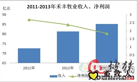 若要說起2014年風頭最強勁的企業(yè),那應當非禾豐牧業(yè)莫屬。一方面是禾豐牧業(yè)今年8月份8日成功上市,上市之后的股票連續(xù)幾天漲停板,一時間成為行業(yè)內(nèi)外關注的熱點企業(yè)之一;另一方面是禾豐牧業(yè)的第六大股東張鐵生。這兩點使得禾豐牧業(yè)還未上市的時候,關于討論其股東張鐵生、禾豐牧業(yè)本身的業(yè)績等等問題便已經(jīng)在網(wǎng)絡上鋪天蓋地。在今年底,在網(wǎng)上做出2014年度網(wǎng)友最關注的飼料企業(yè)的調查,880位網(wǎng)友中,便有115位網(wǎng)友選擇了禾豐牧業(yè),可見禾豐今年的受關注的程度之高。那么在本報告中,靜書將應大家的要求,盡量多角度呈現(xiàn)禾豐的市場情況。 圖8-17 2011-2013年禾豐牧業(yè)收入、凈利潤 從圖中可以看出,2011-2013年禾豐牧業(yè)的收入逐年增長,2013年營業(yè)收入達到85.2億,但是凈利潤走勢相反,2013年凈利潤為1.84億,相比2012年下降了22.6%。正是近年來凈利潤的下降,在禾豐牧業(yè)上市前后,成為眾多機構討論的焦點。2014年8月份上市之后,禾豐牧業(yè)意氣風發(fā)正當時,大舉擴張飼料市場,預計2014年其收入、凈利潤均呈增長的狀態(tài)。 |