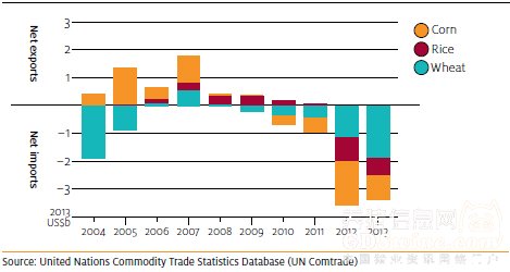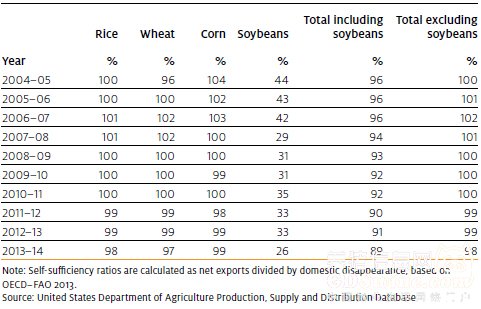 中國(guó)農(nóng)業(yè)食品進(jìn)口最近的趨勢(shì) 2004年以來,中國(guó)農(nóng)業(yè)食品產(chǎn)品(所有可用作食品的農(nóng)業(yè)產(chǎn)出)的進(jìn)口顯著增長(zhǎng)。2004至2013年間,中國(guó)農(nóng)業(yè)食品產(chǎn)品的實(shí)際進(jìn)口額增長(zhǎng)了275%,至990億美元(按2013年的美元價(jià)值計(jì)算)。增長(zhǎng)最快的種類是奶制品(增長(zhǎng)847%)、水果和蔬菜(427%)、油脂和油籽(254%)、肉類和海鮮(209%)和谷物(84%)。 農(nóng)業(yè)食物產(chǎn)品進(jìn)口,中國(guó) 最迅速的進(jìn)口增長(zhǎng)發(fā)生在2009至2013年間,期間中國(guó)農(nóng)業(yè)食品進(jìn)口實(shí)額翻番。中國(guó)消費(fèi)者的日糧改變和收入升高造成不僅對(duì)食品的量的需求增長(zhǎng),而且對(duì)品質(zhì)和多樣性的需求也提高 (Hamshere等人,2014)。隨著該階段一系列日用品的消費(fèi)增長(zhǎng)超過產(chǎn)量增長(zhǎng),國(guó)內(nèi)價(jià)格也出現(xiàn)上漲。中國(guó)政府通過自由貿(mào)易協(xié)定的簽署增加了貿(mào)易開放程度,允許進(jìn)口產(chǎn)品來滿足需求。結(jié)果,水果、蔬菜、肉品、奶制品和海鮮的進(jìn)口顯著增長(zhǎng)。 隨著國(guó)內(nèi)畜牧業(yè)生產(chǎn)隨肉品需求強(qiáng)勁而擴(kuò)張,對(duì)進(jìn)口飼用谷物和油籽的需求也有增長(zhǎng)。 盡管2009年以來目標(biāo)作物的自給自足比例一直維持在95%以上(大豆除外),但持續(xù)的國(guó)內(nèi)高價(jià)格有可能會(huì)給中國(guó)未來在這些作物方面的自給自足能力構(gòu)成挑戰(zhàn)。 禾谷和油籽 中國(guó)的小麥、大米和玉米進(jìn)口過去五年當(dāng)中全都增長(zhǎng),盡管國(guó)內(nèi)產(chǎn)量創(chuàng)下紀(jì)錄。雖然中國(guó)過去零星地進(jìn)口國(guó)這些谷物,但2007年之前中國(guó)是凈出口國(guó)。到2012年,它在全部這三種谷物方面都成了凈進(jìn)口國(guó)。 大豆是中國(guó)進(jìn)口的主要油籽。從2004年以來,大豆進(jìn)口已經(jīng)顯著增長(zhǎng),盡管國(guó)內(nèi)產(chǎn)量已經(jīng)下降。2013年,大豆進(jìn)口總額380億美元,或大約相當(dāng)農(nóng)產(chǎn)品進(jìn)口總額的42%。 大米是中國(guó)膳食的主糧。盡管大米進(jìn)口在國(guó)內(nèi)消費(fèi)量當(dāng)中占的比例很小(大約每年2%),但中國(guó)2013年進(jìn)口的大米是340萬噸。越南是中國(guó)該年最大的供應(yīng)國(guó),占了大米進(jìn)口59%的份額,其次是泰國(guó)(22%)。 在過去五年中,美國(guó)在中國(guó)玉米、小麥和大豆進(jìn)口中占據(jù)了顯著的份額。2013年,美國(guó)供應(yīng)了中國(guó)90%的玉米進(jìn)口、68%的小麥進(jìn)口和35%的大豆進(jìn)口。然而,2013年10月中國(guó)禁止了MIR162玉米的進(jìn)口,這是一種在美國(guó)使用廣泛的轉(zhuǎn)基因品種。結(jié)果,2014年1至8月間,美國(guó)向中國(guó)的玉米出口同比減少了86%。中國(guó)通過國(guó)內(nèi)產(chǎn)量增高和提高從烏克蘭的進(jìn)口量來彌補(bǔ)了這個(gè)空缺。 部分谷物的凈貿(mào)易,中國(guó) 2009年以來谷物進(jìn)口量增長(zhǎng),因?yàn)閲?guó)內(nèi)需求增長(zhǎng),并造成國(guó)內(nèi)價(jià)格升高。國(guó)內(nèi)價(jià)格的增高也是保護(hù)價(jià)格升高的結(jié)果(Gale 2013)。對(duì)那些經(jīng)過額外加工并且用作飼料的作物(例如大米、玉米和大豆)來說,進(jìn)口產(chǎn)品常常是成本最低的選項(xiàng)。作為進(jìn)一步加工的投入材料,低價(jià)的進(jìn)口產(chǎn)品讓加工商能夠保住利潤(rùn)空間。 對(duì)于大米和小麥,鑒于國(guó)營(yíng)貿(mào)易在這些日用品當(dāng)中發(fā)揮的作用,最近進(jìn)口的增長(zhǎng)不大可能長(zhǎng)期維持。小麥進(jìn)口過去兩年主要限于優(yōu)質(zhì)產(chǎn)品,用來與在面粉加工過程中與國(guó)內(nèi)谷物混合 (Price 2014)。2011年小麥國(guó)內(nèi)價(jià)格高于保護(hù)價(jià)格,因此STE未按保護(hù)價(jià)格購(gòu)買任何小麥。這可能造成了2012和2013年間小麥進(jìn)口量的增長(zhǎng),以便支持儲(chǔ)備系統(tǒng)(USDA–FAS 2014)。這和2004年的情況類似,當(dāng)時(shí)中國(guó)進(jìn)口了大量小麥,來投入國(guó)內(nèi)存儲(chǔ),但這并沒有造成小麥進(jìn)口量長(zhǎng)期的增長(zhǎng)。 對(duì)玉米和大豆來說,進(jìn)口增長(zhǎng)多半將會(huì)持續(xù),只要國(guó)內(nèi)價(jià)格仍然居高的話。肉品和畜產(chǎn)品的需求增長(zhǎng),加上保護(hù)價(jià)格的提高,已經(jīng)對(duì)國(guó)內(nèi)飼用谷物價(jià)格構(gòu)成了上行壓力,盡管玉米產(chǎn)量創(chuàng)下紀(jì)錄。因?yàn)橥恋厝匀挥邢?,玉米和大豆產(chǎn)量的任何進(jìn)一步提高不大可能,除非小麥或大米(由于保護(hù)價(jià)格的關(guān)系,這兩種谷物的相對(duì)回報(bào)高于玉米和大豆)的種植面積減少,或生產(chǎn)力獲得實(shí)質(zhì)性的提升。 盡管谷物和油籽進(jìn)口增長(zhǎng),但大米、小麥和玉米方面進(jìn)口量相對(duì)于國(guó)內(nèi)消費(fèi)量來說仍然較小。2013-14年,中國(guó)玉米自給率大約99%,大米大約98%,小麥97%。相比之下,大豆的自給率約為26%。 部分作物的自給率,中國(guó) 肉品與奶制品 中國(guó)肉品和奶制品進(jìn)口額2004至2013年增長(zhǎng)了幾乎10倍(按2013年的美元價(jià)值計(jì)算)。這是收到了中