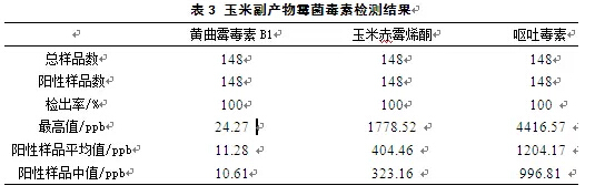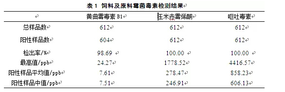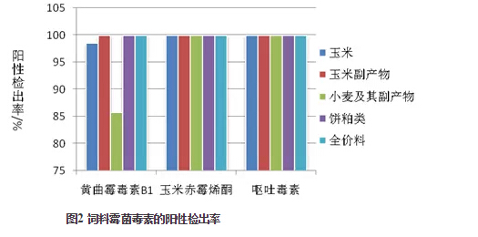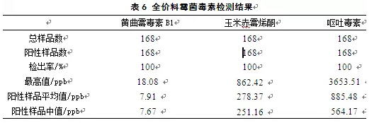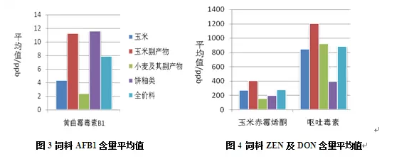 霉菌毒素是由不同絲狀霉菌次級代謝產(chǎn)生的有毒物質(zhì),農(nóng)作物的田間生長、飼料加工儲藏等過程中,環(huán)境的不斷變化會引起霉菌的滋生,進而代謝出大量的霉菌毒素。霉菌毒素的污染不僅給動物帶來危害,而且對人類健康產(chǎn)生了潛在的威脅,是不容忽視的問題。江蘇奧邁生物科技有限公司實驗分析中心對2014年飼料和原料樣本霉菌毒素檢測結(jié)果進行了統(tǒng)計分析,并形成報告,為行業(yè)內(nèi)同仁提供參考。 1 樣品概述 2014年1-12月,江蘇奧邁生物科技有限公司共收到來自江蘇、四川、北京、山東、江西、河南、青島、安徽、浙江、上海等地區(qū)的樣品612份,其中玉米138份、玉米副產(chǎn)品148份、小麥及副產(chǎn)物42份、餅粕類38份,全價料168份及其他78份。實驗分析中心對這612份樣品分別進行了黃曲霉毒素、玉米赤霉烯酮、嘔吐毒素的檢測。 2 檢測方法 樣品采用ELISA酶聯(lián)免疫試劑盒進行霉菌毒素檢測。不同的毒素檢測試劑盒檢測對應的毒素。 為了得到最佳的檢測結(jié)果,實驗分析中心還對不同廠家的試劑盒進行對比、篩選,并將試劑盒所測得結(jié)果與液相色譜法結(jié)果進行比對,選出了最合適的試劑盒。 ELISA試劑盒采用固相直接競爭性酶聯(lián)免疫原理。在包被有相應毒素抗體的微孔中加入標準品或經(jīng)提取溶液處理過的樣品以及酶標物,標準品或樣品中的毒素與毒素偶聯(lián)物競爭抗體,洗去未結(jié)合的酶標記物,TMB底物顯色,加入終止液后用酶標儀在450nm波長下進行檢測。各霉菌毒素的最高限量為:黃曲霉毒素20ppb、玉米赤霉烯酮500ppb、嘔吐毒素1000ppb。 3 檢測結(jié)果 3.1 樣品總體情況 2014年收到的所有樣品均檢測出霉菌毒素,由圖1可以看出,檢測到一種霉菌毒素的樣品為0,檢測到兩種毒素的有8個樣品,占總樣品數(shù)的1.31%,檢測到三種的占98.69%。由此可見,這三種霉菌毒素在飼料及原料中的污染非常普遍,且存在多種霉菌毒素共存的現(xiàn)象。 樣品霉菌毒素的總體檢測情況見表1和圖2。黃曲霉毒素B1陽性檢出率為98.69%,玉米赤霉烯酮和嘔吐毒素陽性檢出率均為100%,其中小麥及副產(chǎn)物的黃曲霉毒素檢出率最低,為85.71%。從各種霉菌毒素的絕對含量來看,黃曲霉毒素B1的最高含量為24.27ppb,來源于玉米淀粉渣。但黃曲霉毒素B1的陽性樣品平均值僅為7.61ppb,中值(表示陽性樣品中50%樣品毒素含量低于該數(shù)值,50%樣品高于該數(shù)值)為7.51ppb,低于國家規(guī)定的飼料衛(wèi)生標準(20ppb);而玉米赤霉烯酮和嘔吐毒素的最高含量分別為1778.52ppb和4416.57ppb(已遠遠超過最高限量),都來源于玉米蛋白飼料。這兩種毒素含量的平均值分別為278.47ppb和858.23ppb,中值分別為246.91pb和606.13ppb。 3.2 玉米樣品檢測結(jié)果 從表2可以看出,玉米樣品中黃曲霉毒素B1的絕對含量不高,平均值和中值分別為4.35ppb和3.08ppb。但嘔吐毒素最高含量達到4320.92ppb,超標率達到了19.12%。玉米赤霉烯酮和嘔吐毒素含量的平均值分別為270.14ppb和844.39ppb,中值分別為225.88ppb和395.37ppb,在飼料衛(wèi)生標準范圍之內(nèi)??傮w看來,今年玉米的嘔吐毒素污染很嚴重。。 3.3 玉米副產(chǎn)物樣品檢測結(jié)果 玉米副產(chǎn)物樣品包括玉米酒糟72份,玉米蛋白粉12份,玉米胚芽粕44份,噴漿玉米皮16份,玉米淀粉渣4份。如表3,此類樣品污染較嚴重,各霉菌毒素的含量都很高,黃曲霉毒素B1、玉米赤霉烯酮和嘔吐毒素含量的平均值分別為11.28ppb、404.46ppb和1204.17ppb,其中,嘔吐毒素含量的平均值已超過了最高限量,最高值為4416.57ppb,來源于玉米蛋白飼料。其超標率達到了52.94%。這三種毒素含量的中值分別為10.61ppb,323.16ppb和996.81ppb。 3.4 小麥及其副產(chǎn)物樣品檢測結(jié)果 從表4可看出,黃曲霉毒素B1的陽性檢出率和含量均較低,其陽性檢出率為85.71%,平均值為2.39ppb;玉米赤霉烯酮的含量也遠低于玉米,平均值為154.78ppb;嘔吐毒素含量相對高一些,其平均值和中值分別為920.75ppb和761.09ppb,主要是麩皮污染嚴重些。 3.5 餅粕類樣品檢測結(jié)果 從表5可以看出,餅粕類樣品黃曲霉毒素B1的含量高于玉米,其最高值達18.95ppb,來源于花生粕。三種毒素含量的平均值分別為11.58ppb,197.88ppb和392.27ppb,中值分別為12.40ppb,211.30ppb和381.05ppb。總體看來,餅粕類樣品主要是黃曲霉毒素污染稍微嚴重一些。 3.6 全價料樣品檢測結(jié)果 由表6可以看出,黃曲霉毒素B1的陽性樣品平均值和中值分別為7.91和7.67,低于國家規(guī)定的標準(20ppb)。玉米赤霉烯酮和嘔吐毒素的陽性檢出率均為100%,平均值分別為278.37ppb和885.48ppb。嘔吐毒素含量很高,最高值達到3653.51ppb,超標率達到11.9%。中值分別為251.16ppb和564.17ppb。由此可見,2014年的全價料樣品霉菌毒素污染狀況嚴重。 3.7 樣品檢測結(jié)果對比 從絕對含量來看(圖3、圖4),玉米副產(chǎn)物樣品的三種毒素含量的平均值均最高;小麥及其副產(chǎn)物樣品的黃曲霉毒素B1和玉米赤霉烯酮含量的平均值均比較低,但嘔吐毒素含量高;餅粕類樣品的黃曲霉毒素B1含量較高;玉米和全價料的玉米赤霉烯酮和嘔吐毒素含量稍高,比黃曲霉毒素B1污染嚴重。 4 概況與結(jié)論 從以上檢測結(jié)果可以看出,黃曲霉毒素B1的發(fā)生概率比玉米赤霉烯酮和嘔吐毒素稍低,污染程度不高。其中,餅粕類的黃曲霉毒素污染稍重一點。 玉米赤霉烯酮和嘔吐毒素的陽性檢出率較高,但