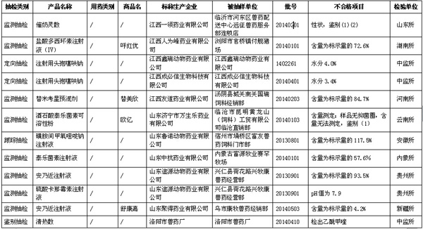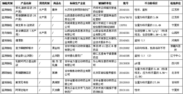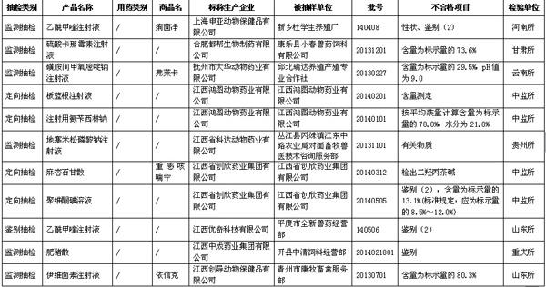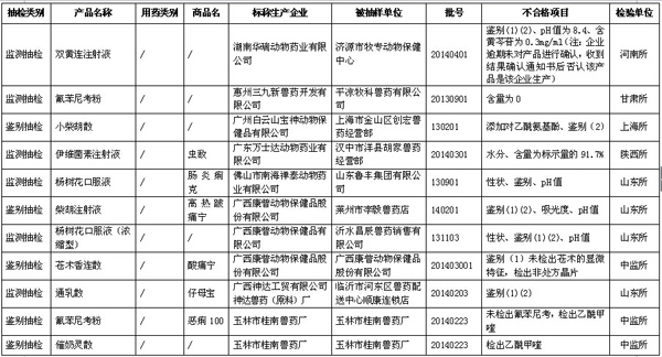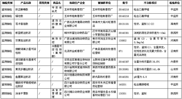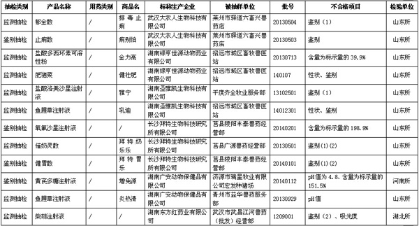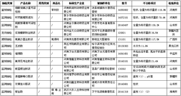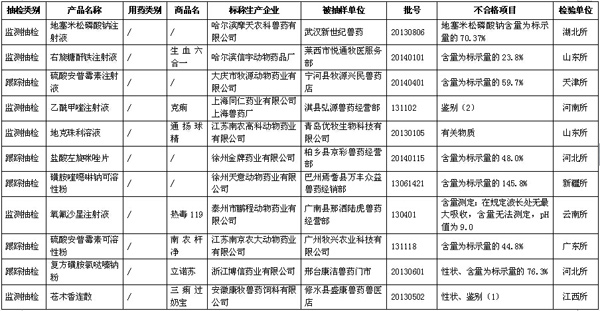 據(jù)農(nóng)業(yè)部獸醫(yī)局1月27日公布數(shù)據(jù)顯示,2014年第三季度全國共抽檢出不合格獸藥201批,不合格生物制品3批。詳見表格(為便于觀察,刪除了序號等表格項(xiàng)目)。 農(nóng)業(yè)部關(guān)于2014年第四期獸藥質(zhì)量監(jiān)督抽檢的通報(bào) 按照我部統(tǒng)一部署,全國31個(gè)省級獸藥監(jiān)察所和中國獸醫(yī)藥品監(jiān)察所組織完成了2014年第三季度獸藥質(zhì)量監(jiān)督抽檢計(jì)劃。現(xiàn)將抽檢情況通報(bào)如下。 一、基本情況 2014年第三季度共完成獸藥(不包括獸用生物制品)監(jiān)督抽檢3984批,合格3783批,不合格201批(附件1、附件2),合格率為95.0%,比2014年第二季度(95.6%)下降0.6個(gè)百分點(diǎn),比2013年同期(93.6%)提高1.4個(gè)百分點(diǎn)。其中,獸藥監(jiān)測抽檢共抽檢2828批,合格2695批,合格率為95.3%;獸藥跟蹤抽檢共抽檢605批,合格585批,合格率為96.7%;獸藥定向抽檢共抽檢135批,合格121批,合格率為89.6%;獸藥鑒別抽檢共抽檢416批,合格382批,合格率為91.8%。 從抽檢環(huán)節(jié)看,生產(chǎn)環(huán)節(jié)抽檢597批,合格572批,合格率為95.8%,比2014年第二季度(97.6%)下降1.8個(gè)百分點(diǎn);經(jīng)營環(huán)節(jié)抽檢2736批,合格2589批,合格率為94.6%,比2014年第二季度(95.1%)下降0.5個(gè)百分點(diǎn);使用環(huán)節(jié)抽檢651批,合格622批,合格率為95.5%,比2014年第二季度(95.6%)下降0.1個(gè)百分點(diǎn)。 從產(chǎn)品類別看,化藥類產(chǎn)品共抽檢1952批,合格1881批,合格率為96.4%,比2014年第二季度(96.1%)提高0.3個(gè)百分點(diǎn);抗生素類產(chǎn)品共抽檢1128批,合格1085批,合格率為96.2%,比2014年第二季度(97.2%)下降1.0個(gè)百分點(diǎn);中藥類產(chǎn)品共抽檢879批,合格792批,合格率為90.1%,比2014年第二季度(92.5%)下降2.4個(gè)百分點(diǎn);其他類產(chǎn)品共抽檢25批,合格25批,合格率為100%。 2014年第三季度共完成獸用生物制品監(jiān)督抽檢125批,合格122批,不合格3批(附件3),合格率97.6%。 關(guān)于2014年第三季度獸藥抽檢合格產(chǎn)品相關(guān)信息,請登陸“中國獸藥信息網(wǎng)”的“國家獸藥基礎(chǔ)信息查詢系統(tǒng)”查閱。 二、重點(diǎn)監(jiān)控企業(yè) 根據(jù)重點(diǎn)監(jiān)控企業(yè)劃分原則,判定以下7家企業(yè)為重點(diǎn)監(jiān)控企業(yè):1.山西華興動物藥業(yè)有限公司(全年獸藥質(zhì)量通報(bào)產(chǎn)品含量低于20% 2批次以上的,2014年第三季度2批次);2.合肥都幫生物制藥有限公司(全年獸藥質(zhì)量通報(bào)產(chǎn)品含量低于20% 2批次以上的,2014年第二季度、第三季度各1批次);3.山東誼源動物藥業(yè)有限公司(每期獸藥質(zhì)量通報(bào)中同一企業(yè)被抽檢產(chǎn)品少于50批且不合格產(chǎn)品累計(jì)5批次以上的);4.武漢大農(nóng)人生物科技有限公司(每期獸藥質(zhì)量通報(bào)中同一企業(yè)被抽檢產(chǎn)品少于50批且不合格產(chǎn)品累計(jì)5批次以上的);5.玉林市桂南獸藥廠(每期獸藥質(zhì)量通報(bào)中屬于改變組方違法添加其他獸藥成分2批次以上,2014年第三季度4批);6.西安樂道生物科技有限公司(每期獸藥質(zhì)量通報(bào)中屬于改變組方違法添加其他獸藥成分2批次以上,2014年第三季度3批)。 三、存在的主要問題 從第三季度抽檢情況看,鑒別和含量不合格仍然是獸藥質(zhì)量檢驗(yàn)不合格的主要項(xiàng)目,部分產(chǎn)品含量較低甚至為0,個(gè)別產(chǎn)品含量無法測定、改變組方違法添加其他獸藥成分。 四、工作要求 (一)依法從重處罰違法行為 各地要按照農(nóng)業(yè)部公告2071號規(guī)定,對2014年3月3日后生產(chǎn)、符合從重處罰的,依法予以從重處罰,并及時(shí)將有關(guān)材料報(bào)我部獸醫(yī)局,啟動吊銷獸藥產(chǎn)品批準(zhǔn)文號及獸藥生產(chǎn)許可證程序。對鑒別檢驗(yàn)不合格的,各檢驗(yàn)機(jī)構(gòu)要進(jìn)一步開展檢驗(yàn),確定其是否存在改變制劑組方、非法添加其他藥物成分等違法行為,為處罰提供技術(shù)支持。 (二)組織開展查處活動 各地要集中力量對被通報(bào)的假劣獸藥組織開展查處活動,對相關(guān)違法企業(yè)實(shí)施飛行檢查,責(zé)令生產(chǎn)企業(yè)召回銷毀假劣獸藥,對違法行為依法組織查處。其中,對鑒別、含量不合格的產(chǎn)品,責(zé)令企業(yè)對不合格產(chǎn)品停產(chǎn)整改,查找原因,保證產(chǎn)品質(zhì)量,經(jīng)企業(yè)所在地省級獸醫(yī)管理部門審核整改合格后,方可恢復(fù)生產(chǎn)。各省級獸醫(yī)管理部門及時(shí)將查處結(jié)果及企業(yè)整改結(jié)果報(bào)我部獸醫(yī)局。 (三)加強(qiáng)獸藥質(zhì)量信息通報(bào) 各地要及時(shí)將抽檢結(jié)果信息通報(bào)轄區(qū)內(nèi)有關(guān)單位,防止養(yǎng)殖者誤用假劣獸藥,提高養(yǎng)殖安全用藥水平。 (四)繼續(xù)強(qiáng)化獸藥企業(yè)日常監(jiān)管 各地要加強(qiáng)本轄區(qū)獸藥生產(chǎn)企業(yè)的獸藥GMP后續(xù)監(jiān)管,對違反獸藥GMP規(guī)定的,責(zé)令其限期整改。要進(jìn)一步加強(qiáng)獸藥經(jīng)營企業(yè)的獸藥GSP后續(xù)監(jiān)管,強(qiáng)化獸藥采購源頭管理,保障經(jīng)營市場獸藥的合法性。對監(jiān)管中發(fā)現(xiàn)的違法行為要依法及時(shí)予以處理。 附件: 1. 2014年第三季度全國獸藥質(zhì)量監(jiān)督抽檢國家
