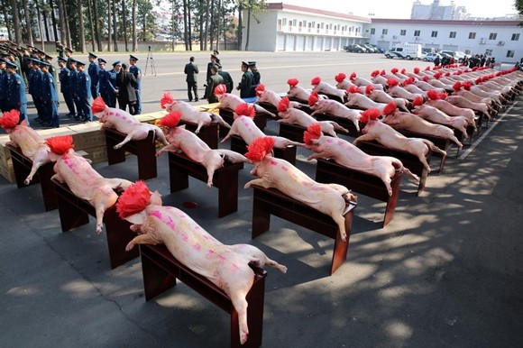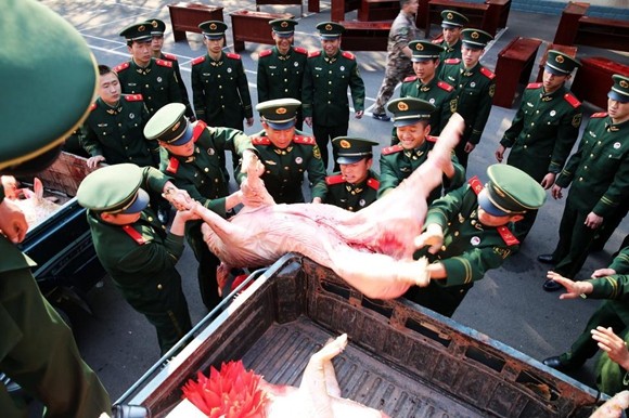2015年2月8日,四川涼山,新春佳節(jié)即將來臨之際,四川省涼山州西昌市組成“省州市”慰問團(tuán),來到?jīng)錾杰姺謪^(qū)親切看望長(zhǎng)期駐守在涼山州的解放軍、武警和公安干警,為人民子弟兵送上了蔬菜、水果、雞蛋、飲料、現(xiàn)金以及66頭肥豬等慰問品。圖為士兵們搬運(yùn)豬肉。 圖為士兵們搬運(yùn)豬肉。 來源: 中國(guó)日?qǐng)?bào)網(wǎng) |