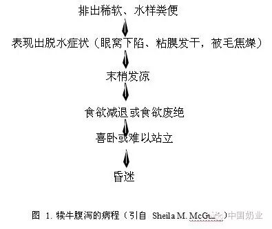 因其病因復(fù)雜,犢牛腹瀉的臨床表現(xiàn)根據(jù)病程可從稀軟糞便至半昏迷狀態(tài)表現(xiàn)多樣(參見圖 1)。發(fā)病初期,犢牛排出稀軟、水樣糞便;隨著病程的發(fā)展,犢牛可能表現(xiàn)出脫水的癥狀(如眼窩下陷、粘膜干燥、被毛焦燥等);隨著脫水狀況的加重,患犢可能表現(xiàn)出末梢發(fā)涼、食欲減退或廢絕、喜臥或難以站立、昏迷等癥狀。