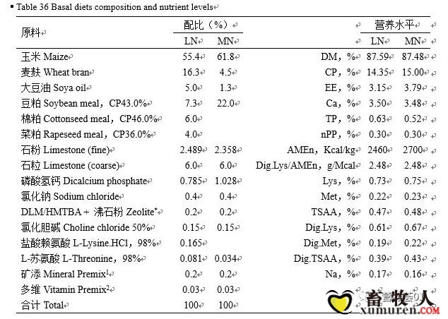 正文摘要:1、引言 本試驗的目的是考察自由采食條件下飼糧營養(yǎng)水平和HMTBA相對生物學(xué)效價(80%、84%和88%)對蛋雞生產(chǎn)性能的影響。 2、試驗設(shè)計與處理設(shè)置 試驗采用完全隨機(jī)試驗設(shè)計,分別在2種飼糧營養(yǎng)水平(LN:Dig.Lys0 ... |