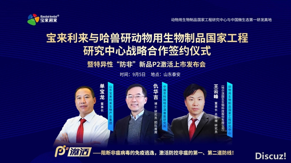 正文摘要:寶來利來與哈獸研國生生物戰(zhàn)略合作簽約儀式暨特異性“防非”新品P2激活上市發(fā)布會 2020年寶來利來“防非”新品隆重鉅獻(xiàn),寶來利來與哈獸研動物用生物制品國家工程研究中心進(jìn)行戰(zhàn)略合作簽約儀式——暨特異 ... |