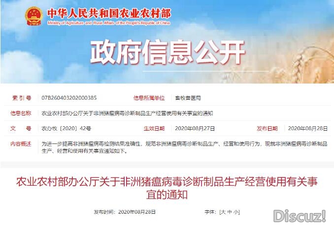 正文摘要:​農(nóng)業(yè)農(nóng)村部官網(wǎng)28日發(fā)布《關(guān)于非洲豬瘟病毒診斷制品生產(chǎn)經(jīng)營使用有關(guān)事宜的通知》指出,自2020年9月1日起,所有未參加或未通過中國動(dòng)物疫病預(yù)防控制中心比對(duì)試驗(yàn)的非洲豬瘟病毒診斷制品,以及通過比對(duì)試驗(yàn)但 ... |