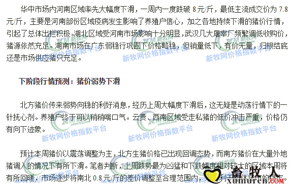 正文摘要:第42周(10月11日-10月17日)據(jù)新牧網(wǎng)監(jiān)測(cè)價(jià)格可以看出,上周全國(guó)生豬平均價(jià)格下滑0.27元/斤,周六全國(guó)生豬平均價(jià)格為8.32元/斤,全國(guó)生豬平均價(jià)格進(jìn)入快速下滑通道。10月17日新牧網(wǎng)豬價(jià)指數(shù)為130.89,一周內(nèi)豬 ... |