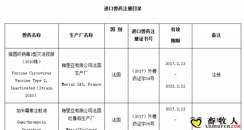 正文摘要:中華人民共和國(guó)農(nóng)業(yè)部公告 第2497號(hào) 根據(jù)《獸藥管理?xiàng)l例》和《獸藥注冊(cè)辦法》規(guī)定,經(jīng)審核,批準(zhǔn)梅里亞有限公司法國(guó)生產(chǎn)廠等2家公司生產(chǎn)的豬圓環(huán)病毒2型滅活疫苗(1010株)等2個(gè)獸藥產(chǎn)品在我國(guó)注冊(cè),核發(fā)《進(jìn) ... |