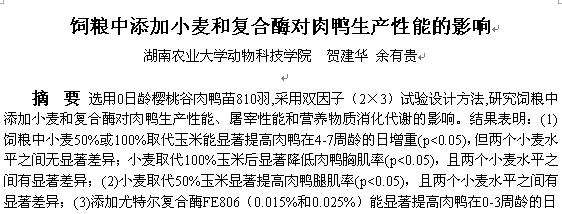 飼糧中添加小麥和復(fù)合酶對肉鴨生產(chǎn)性能的影響 |