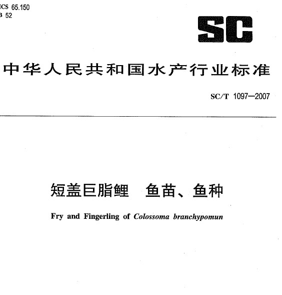 SCT 1097-2007 短蓋巨脂鯉 魚苗、魚種 |
