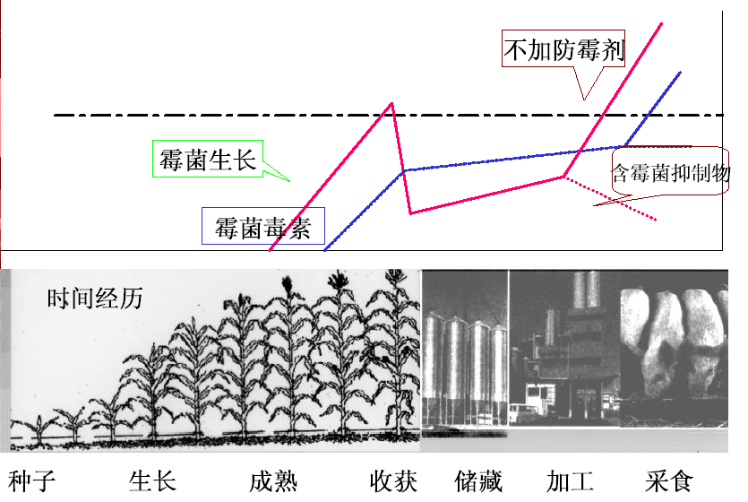 一粒種子從發(fā)芽、生長(zhǎng)、結(jié)果到成熟的過程中已經(jīng)受到霉菌的污染,如果不添加霉菌抑制物在經(jīng)過加工之后霉菌會(huì)急速生長(zhǎng),霉菌毒素得到快速沉積,添加了霉菌抑制物之后霉菌停止生長(zhǎng),霉菌毒素停止沉積。圖2 霉菌毒素污染的糧食