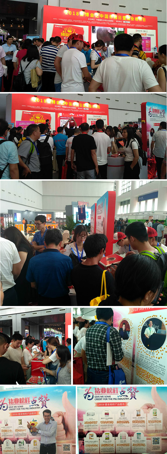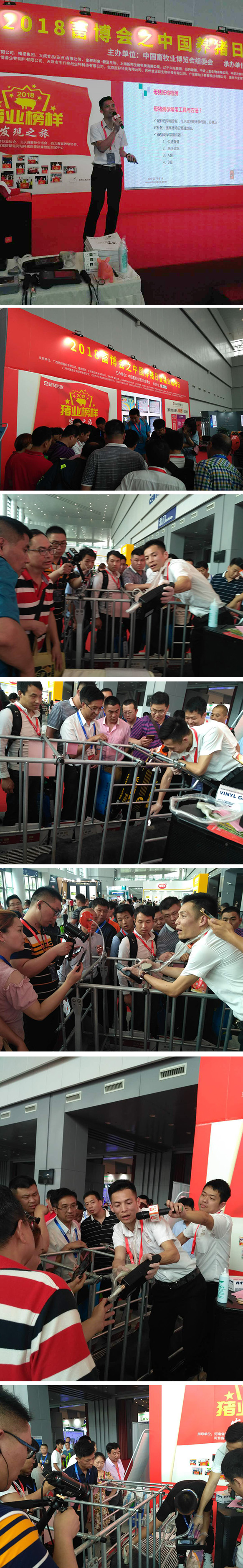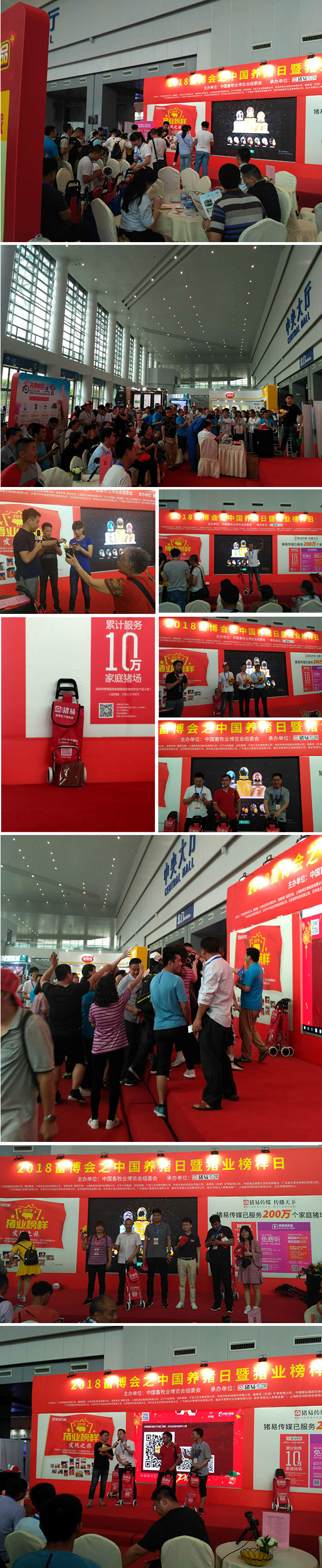 2018年5月18日第八屆(2018)中國養(yǎng)豬日暨豬業(yè)榜樣日活動在重慶國際博覽中心N9館北側廳養(yǎng)豬日活動區(qū)圓滿舉辦,活豬秀真實感受中國育種發(fā)展,育種B超檢測秀及天寶看圖識病專場活動將高深的技術與有趣互動完美結合,為榜樣點贊區(qū)人擠人,搶養(yǎng)豬能手紅包大作戰(zhàn)紅包、微信大屏搖一搖馬拉松、消消樂等互動游戲熱鬧樂翻天,豬易直播團隊更是實現(xiàn)了活動區(qū)和直播企業(yè)現(xiàn)場的鏡頭切換,帶領2.3萬線上養(yǎng)豬人一起逛畜博、見證參展的豬業(yè)榜樣。